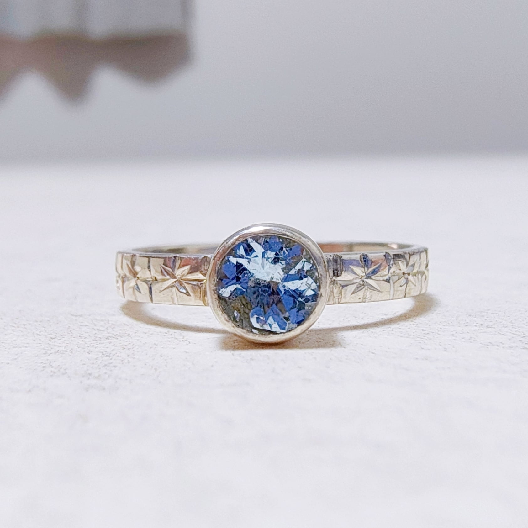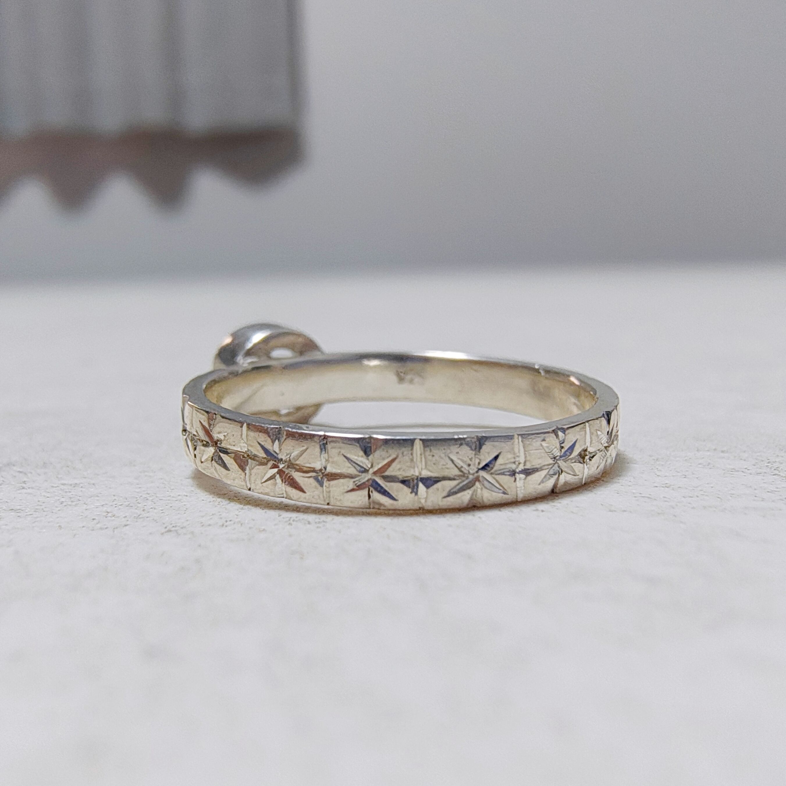 繊細なシルバーリングに、可憐な勿忘草の模様を一つ一つ丁寧に手彫りしました。